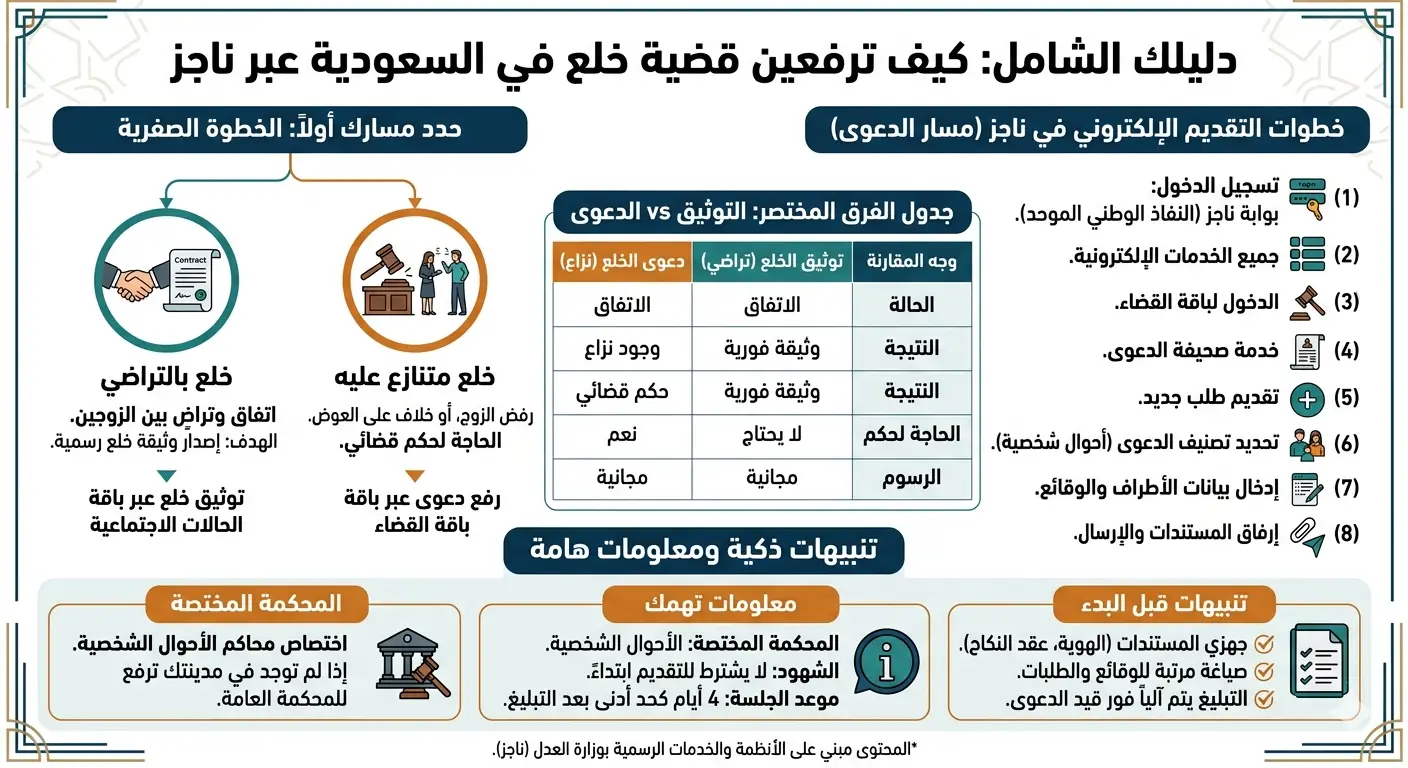 ولهذا فإن السؤال الأدق ليس فقط: كيف ارفع قضية خلع؟ بل أيضاً: هل حالتي تحتاج أصلاً إلى دعوى، أم أن المسار الصحيح هو توثيق الخلع عبر ناجز؟ هذا الفرق هو الذي يحدد نوع الخدمة، وطريقة التقديم، وطبيعة الإجراء من البداية.